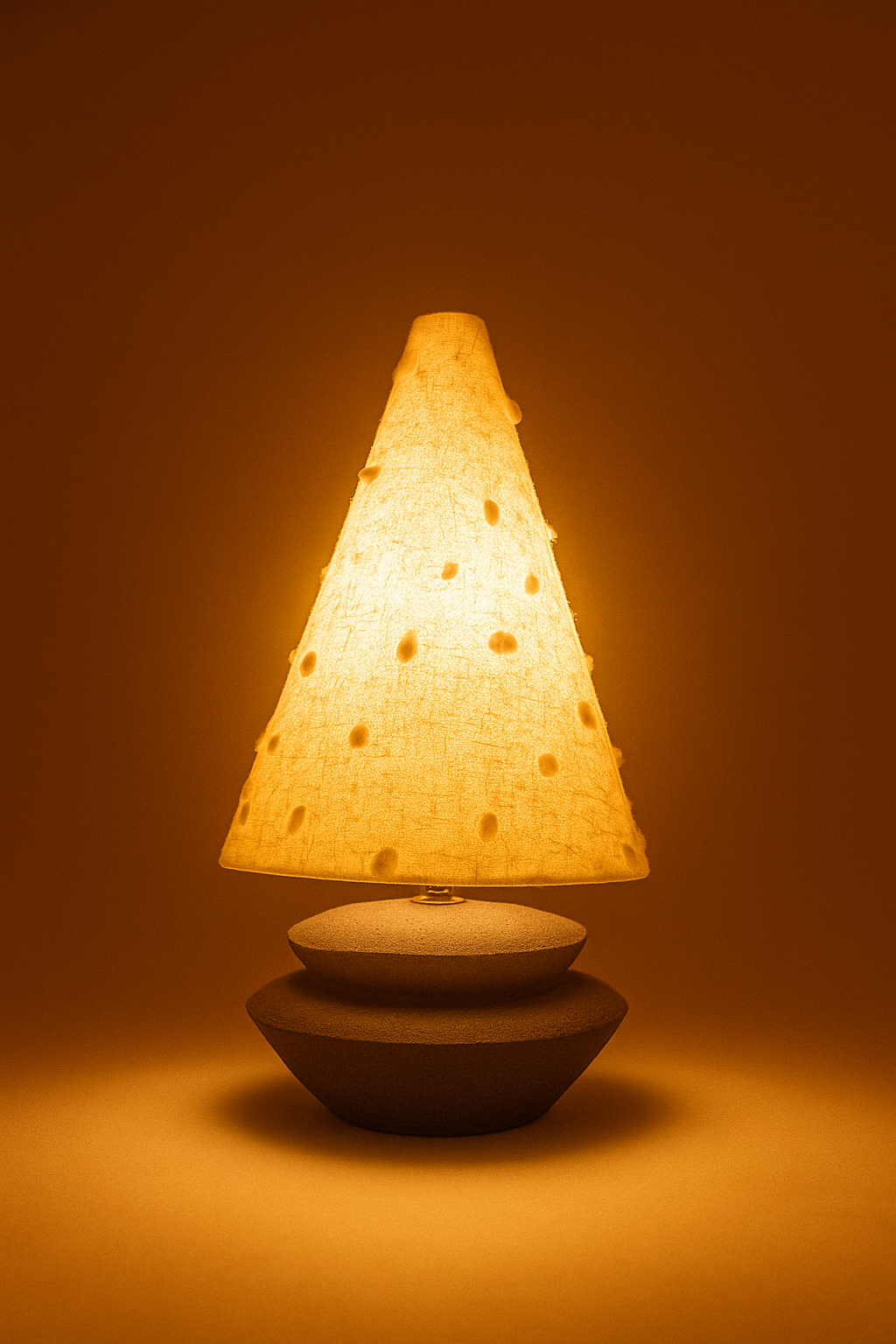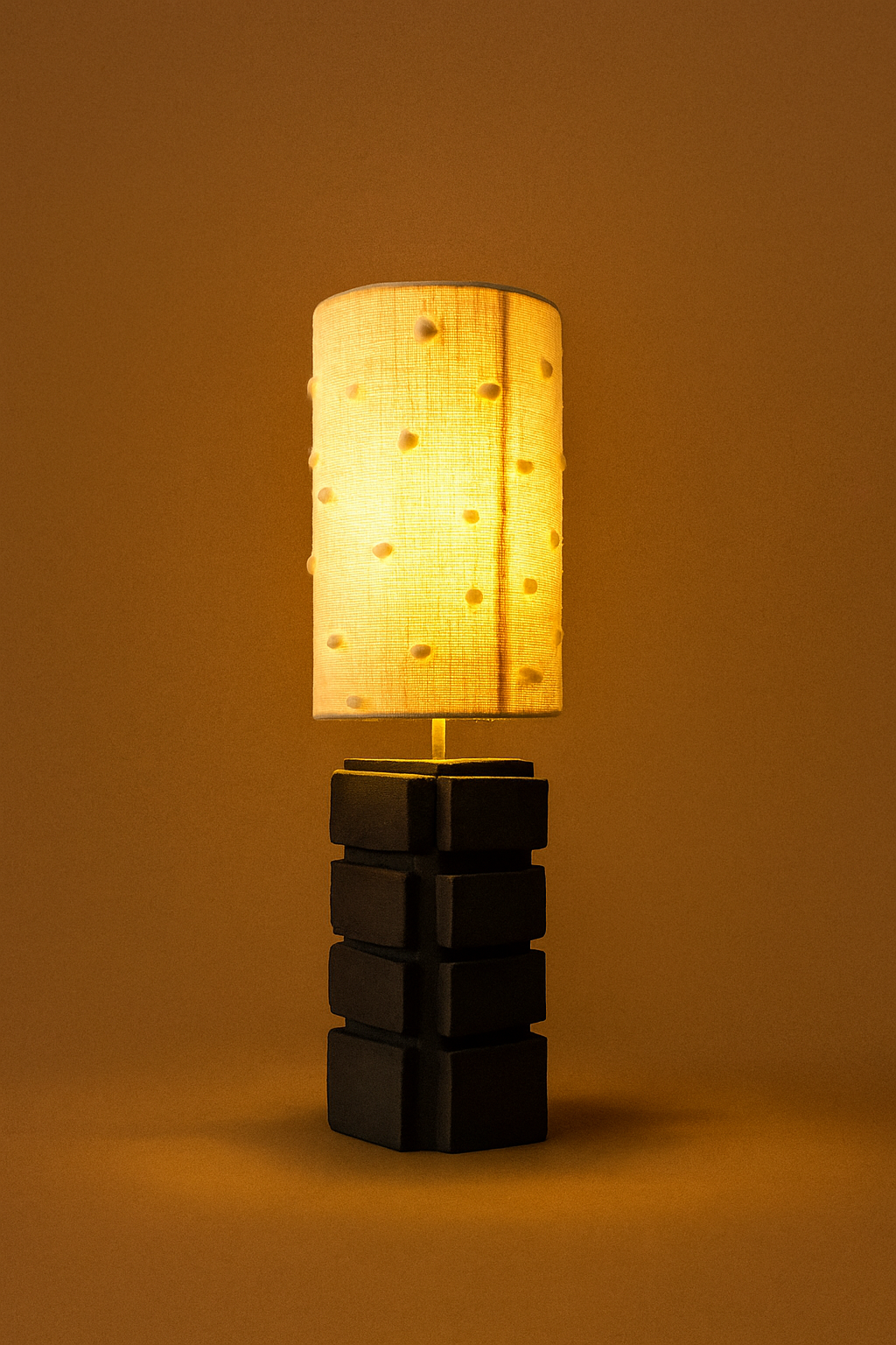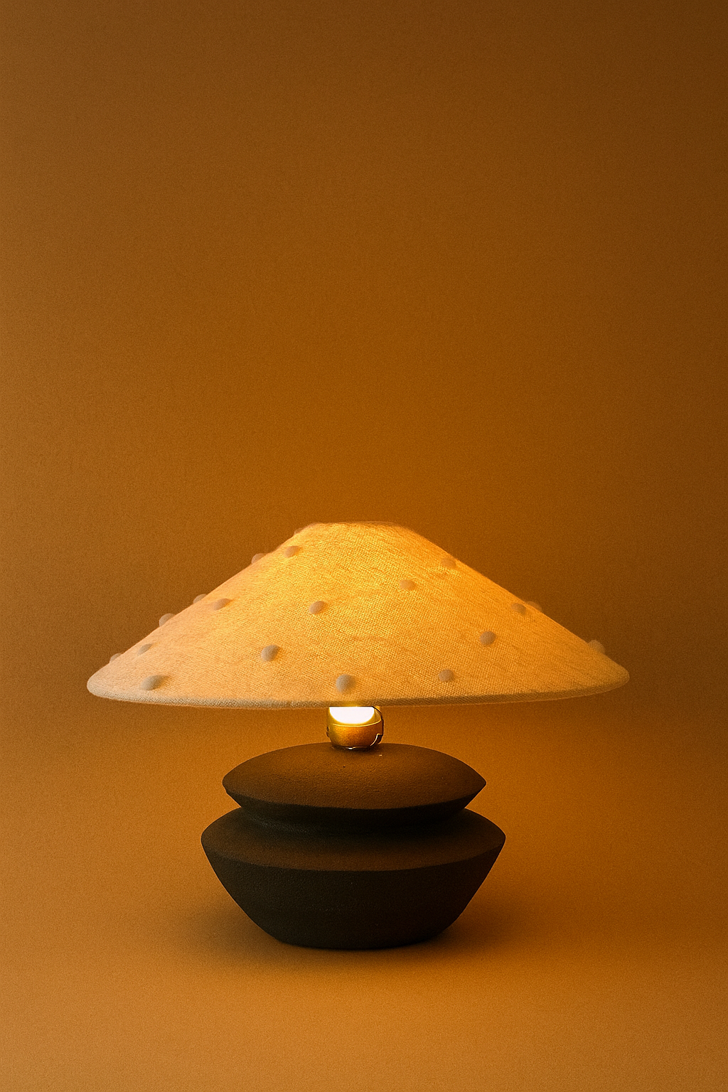 Black stoneware ceramic lamp base grounds a whimsical tufted light shade hand woven from self harvested sheep’s wool.